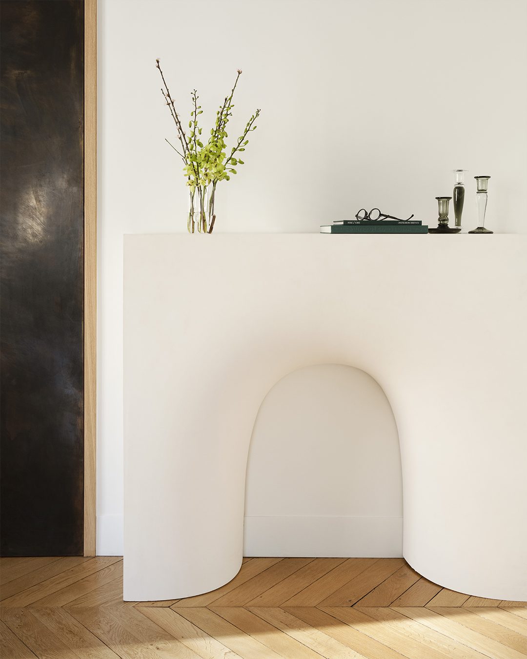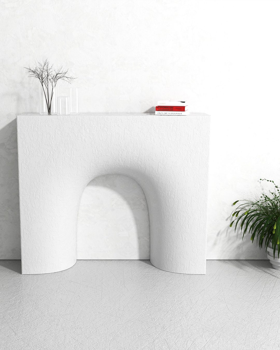 Console décorative en plâtre évoquant un feu de cheminée, elle trouvera parfaitement sa place dans les salles de réception ou les entrées d'intérieurs où l'art de recevoir est primordial.